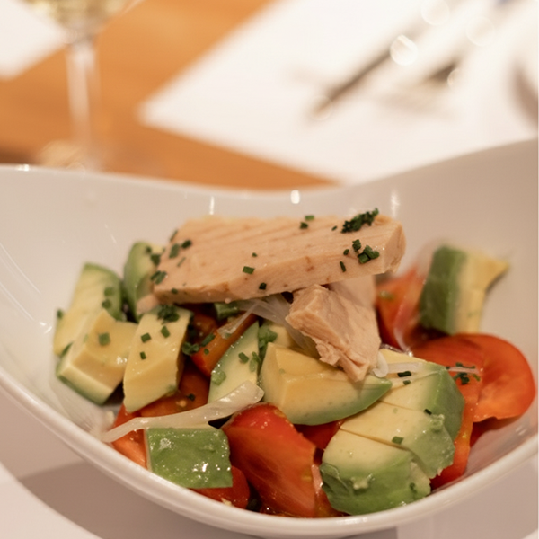Ensalada de tomate de temporada y melva canutera con agua de pepino y albahaca