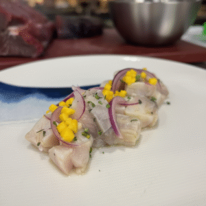 Ceviche de corvina y crujiente de su piel